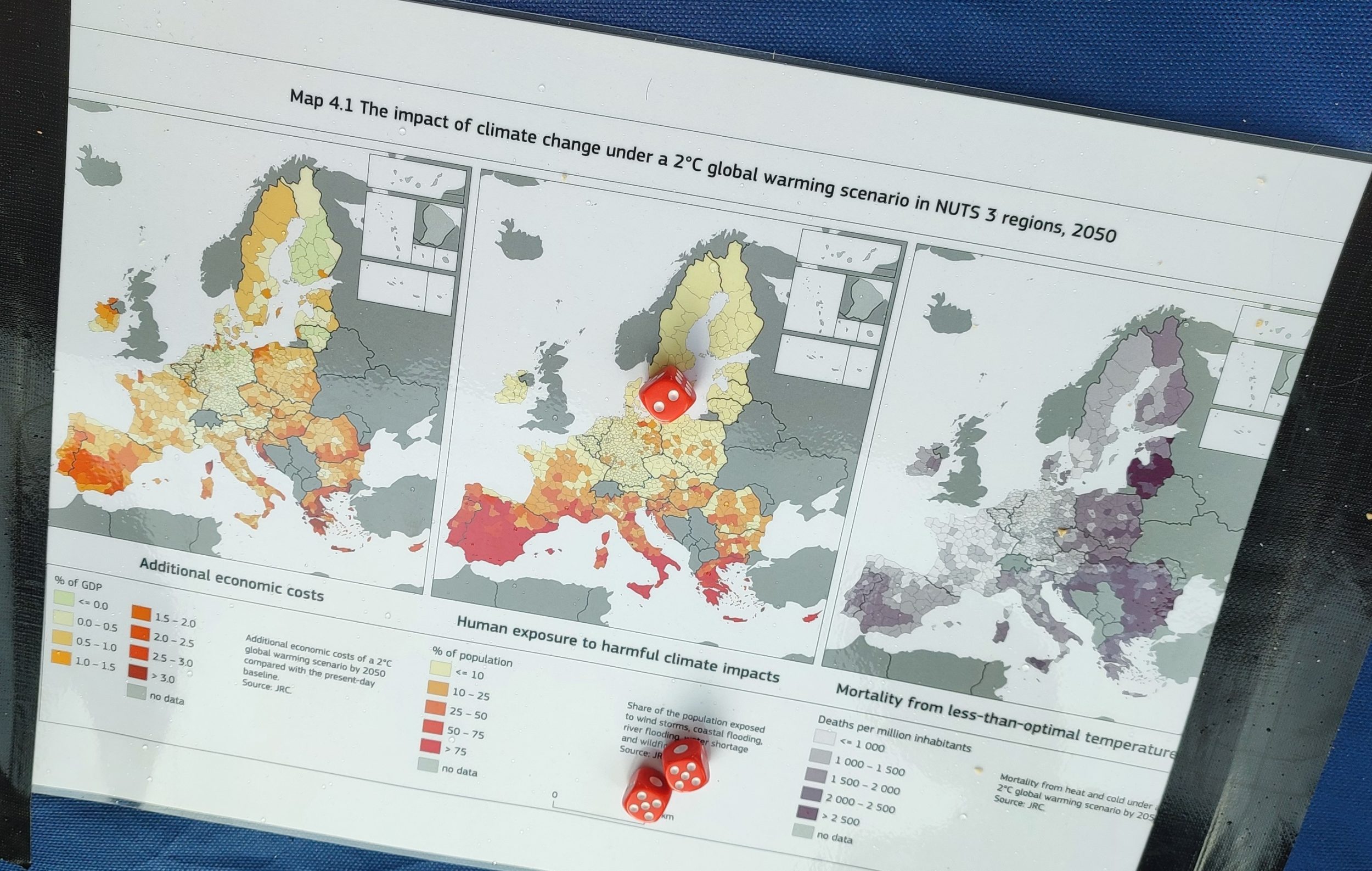The UC GreenPaths team designed a series of maps of Europe, using colour-coded zones to mark out different parts of Europe. Participants had to roll a dice and depending on the outcome, were asked different questions about regions in Europe. Questions focused on, for example, which areas of Europe were more or less vulnerable to climate change. This exercise heightened participants’ awareness of Europe’s vulnerability to climate change, as well as Europe’s varied vulnerability to Green Transition.